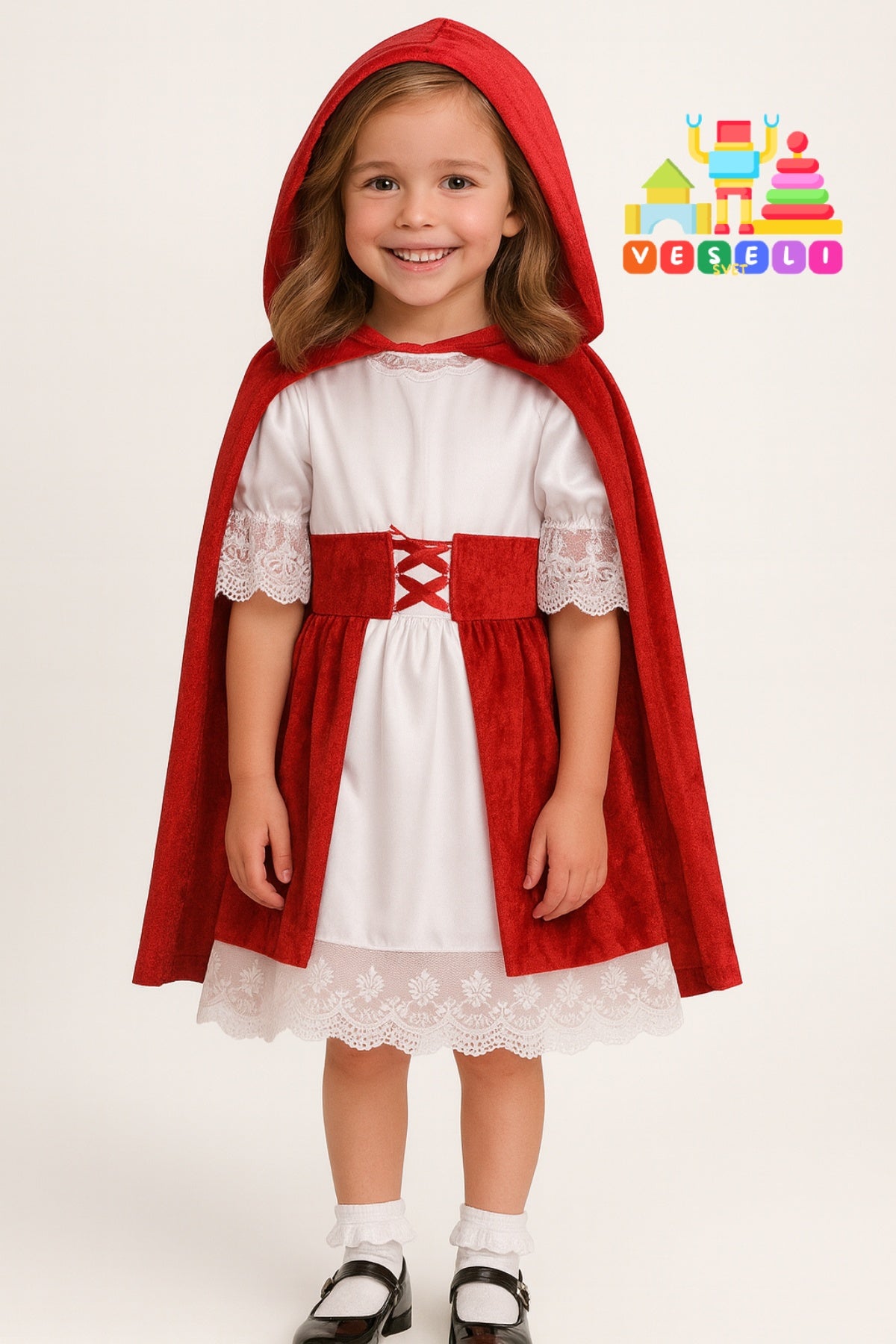 Naš kostim Crvenkape izrađen je od kvalitetnih, nežnih materijala prijatnih za dečiju kožu. Set sadrži belu haljinicu , kao i prepoznatljivi crveni plašt sa kapuljačom koji lepo pada.
