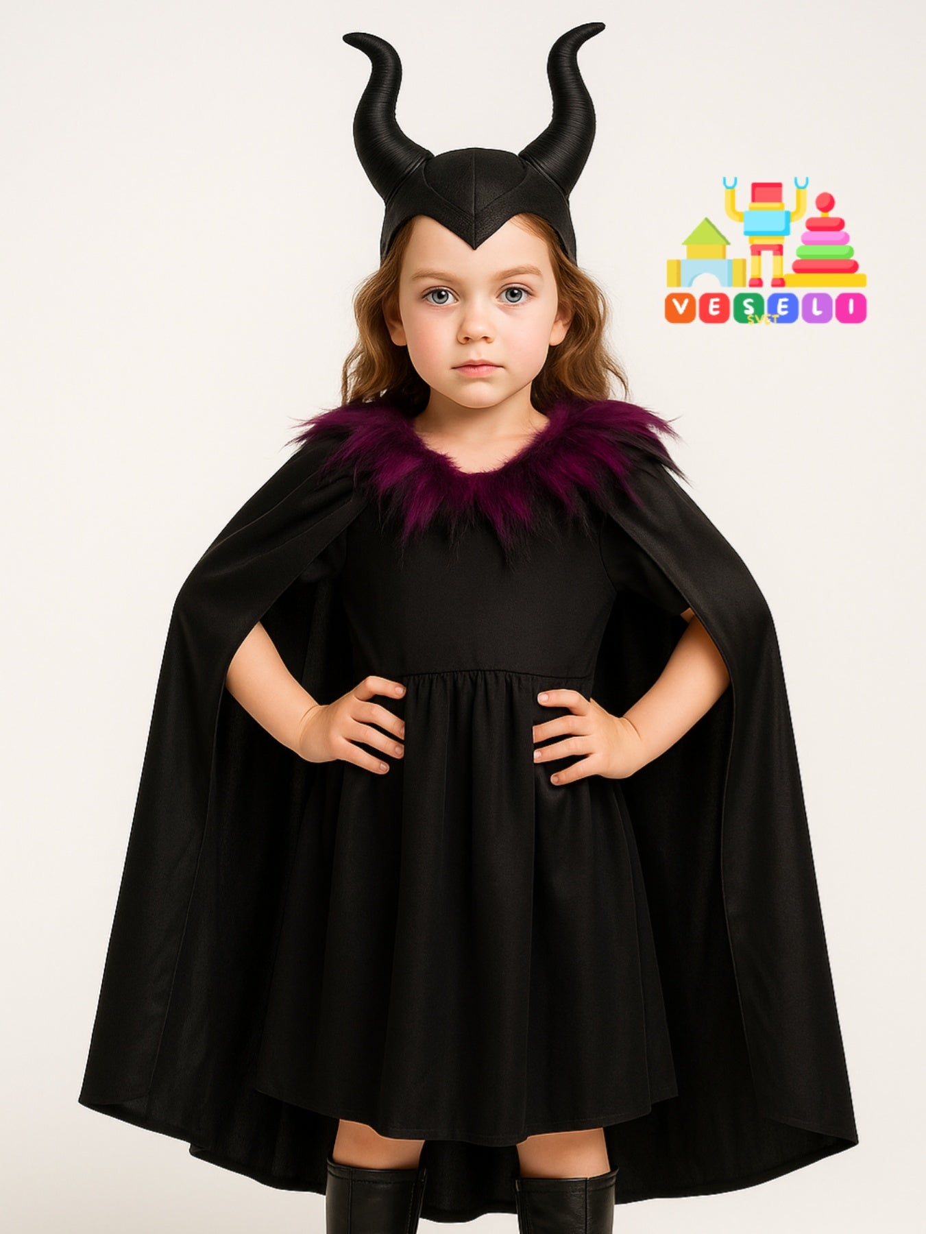 Pretvorite svaku priliku u bajku uz prelepi Grdana kostim za devojčice! Kostim sadrži crnu haljinu kratkih rukava sa elegantnim plaštom, efektni ljubičasti perjani detalj oko kragne i prepoznatljivu kapu sa visokim, zakrivljenim rogovima. Izrađen od laganih i udobnih materijala, idealan je za maskenbale, rođendanske proslave, Halloween ili maštovitu igru kod kuće.,