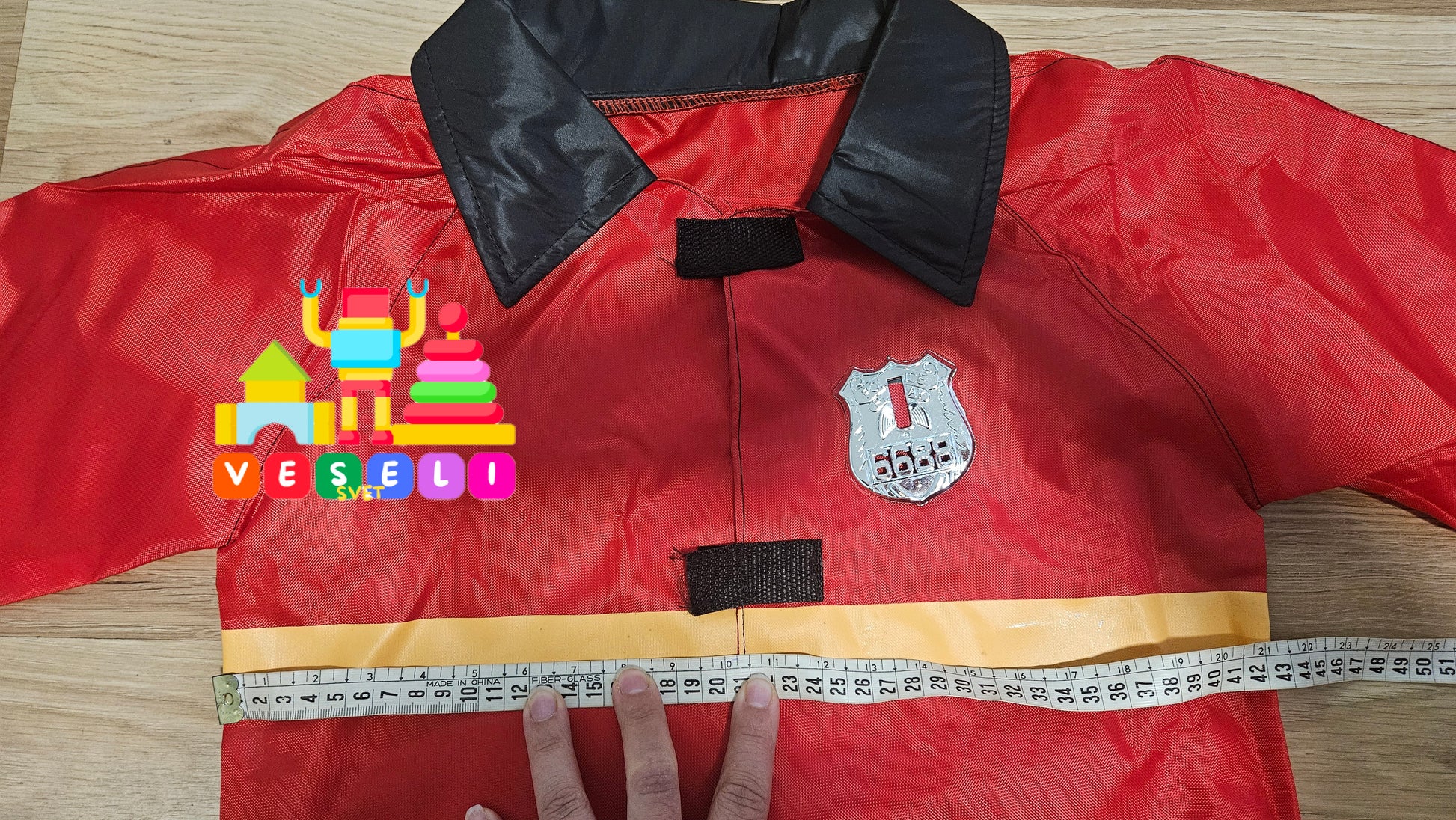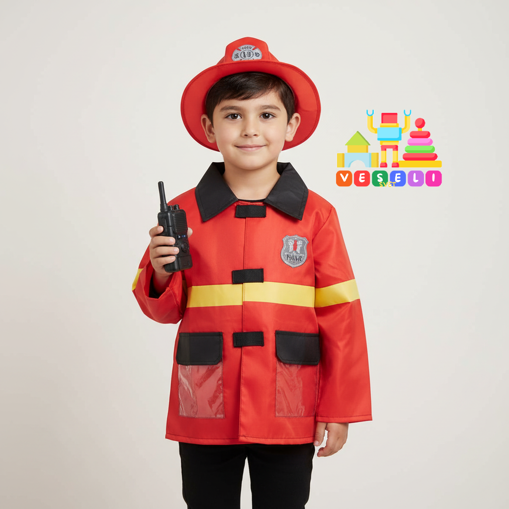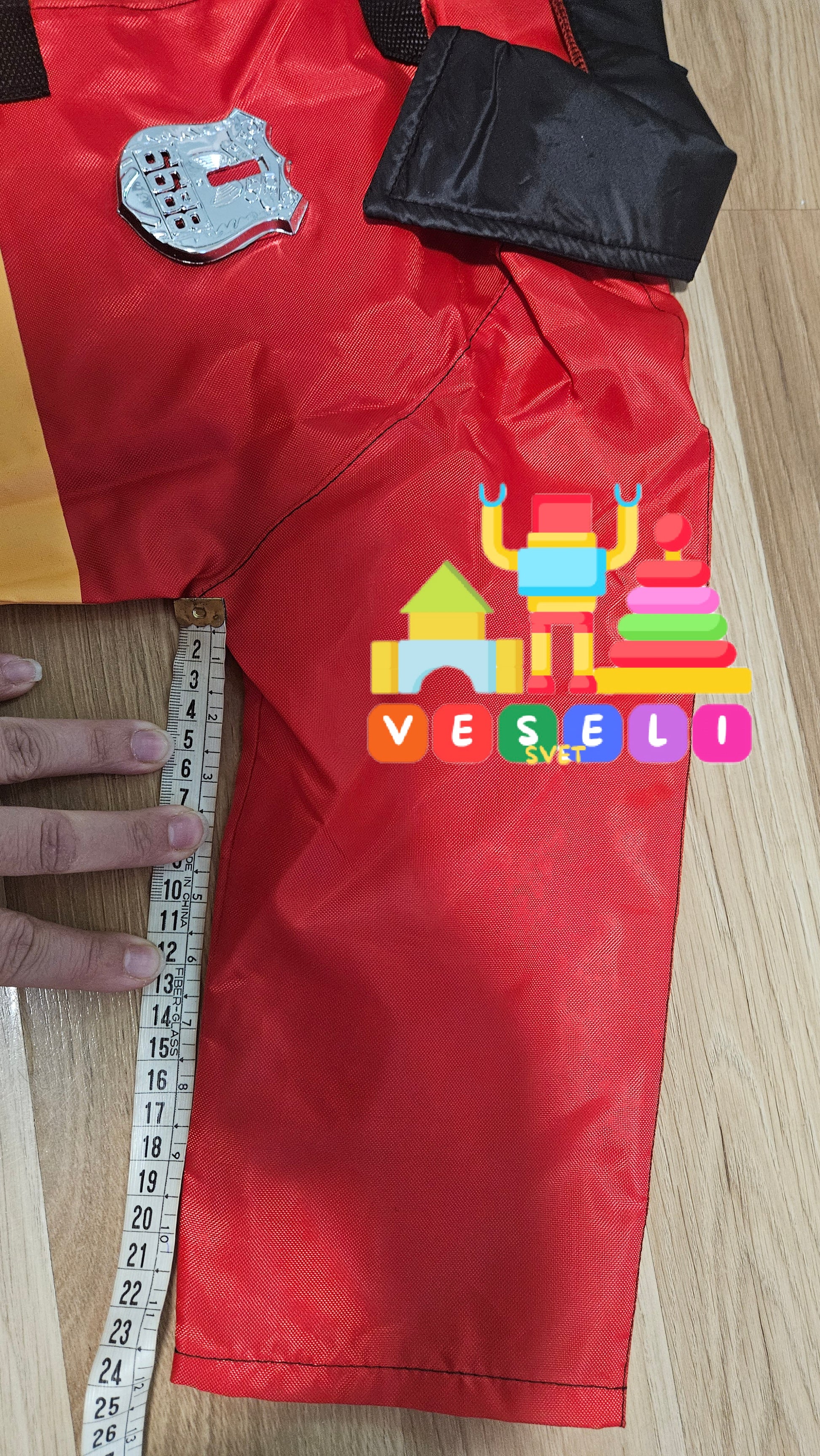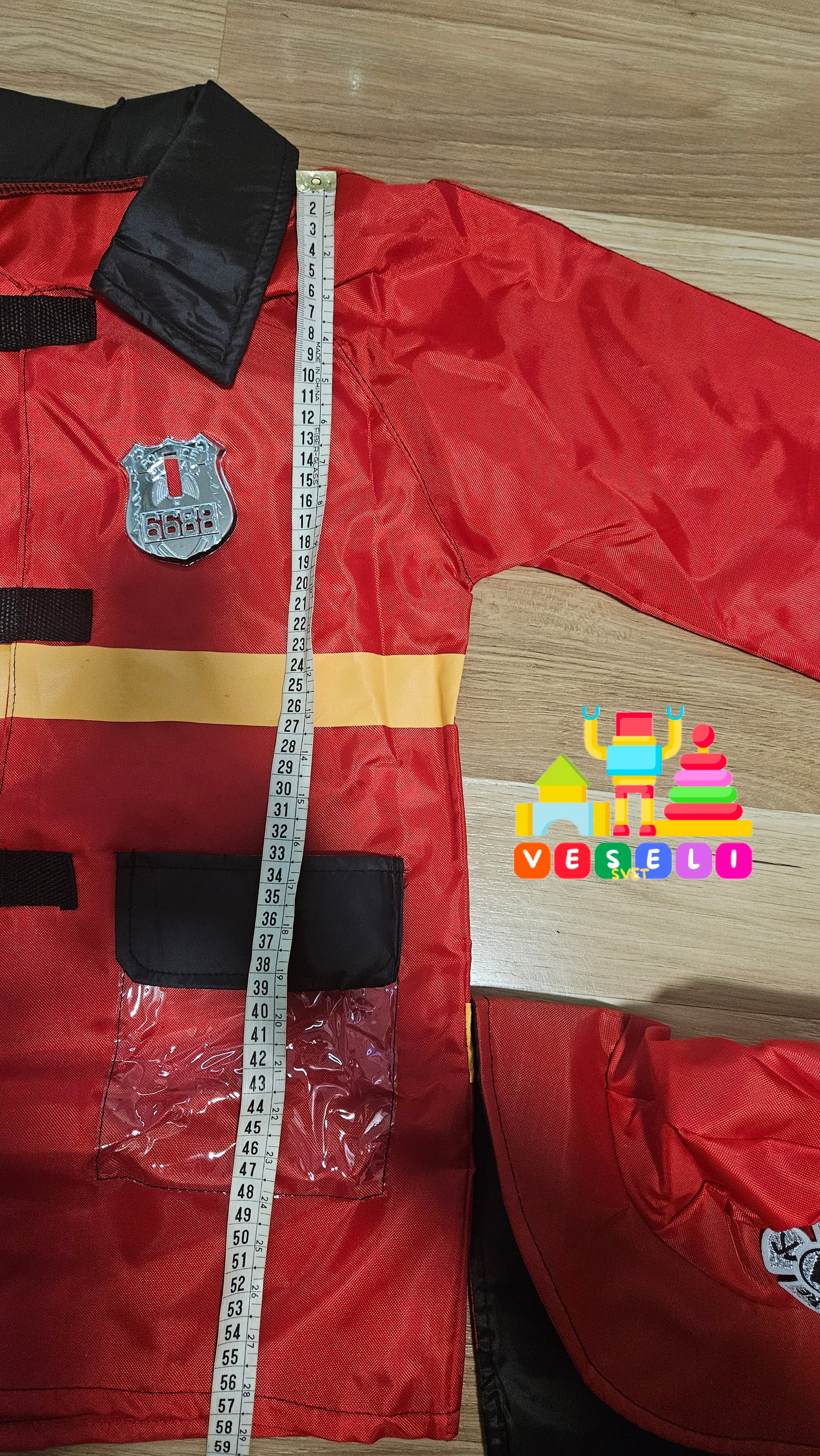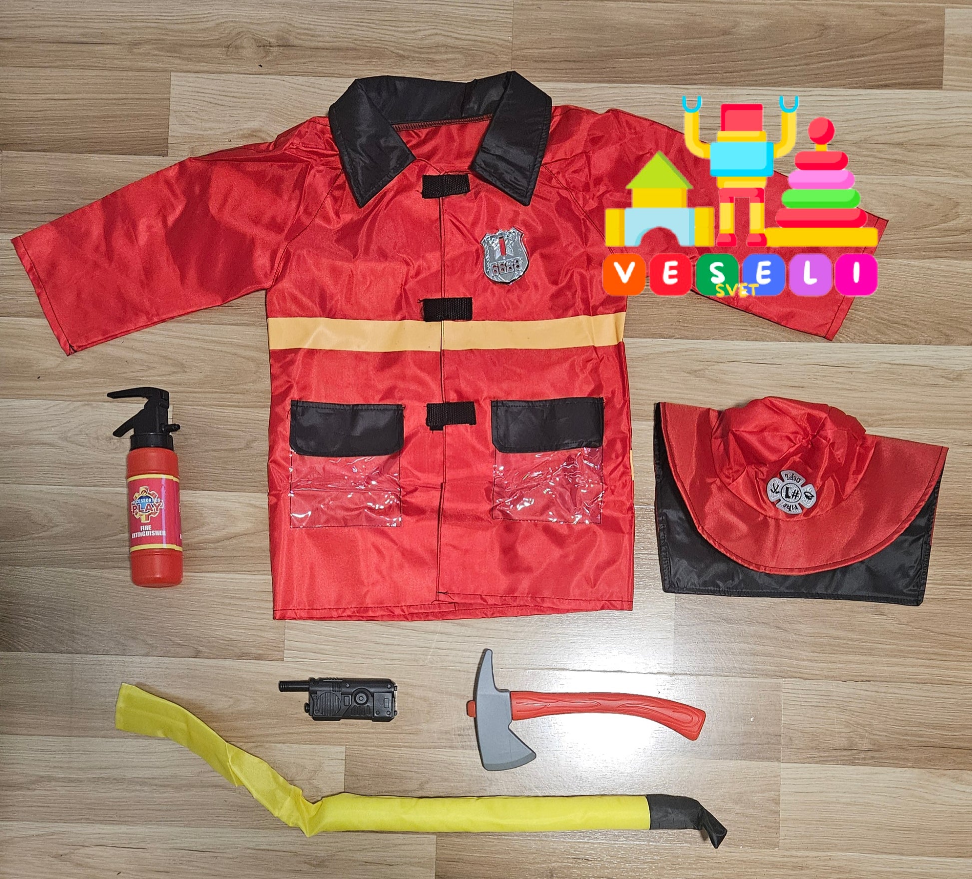 Prepoznatljiva crvena jakna sa žutim i crnim detaljima a širok šešir pruža dodatni efekat profesionalnog vatrogasca. Set uključuje i rekvizite koji dodatno podstiču igru i kreativnost – aparat za „gašenje“, sekiru, radio-stanicu i crevo.