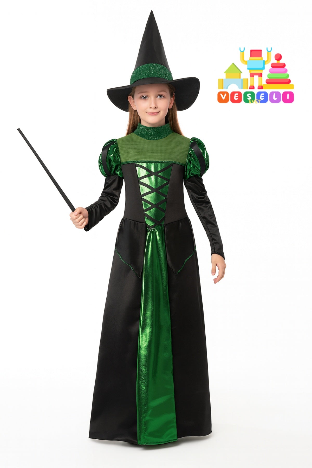 Ovaj elegantni kostim zelene veštice kombinuje luksuzne materijale i upečatljive boje koje stvaraju pravi magični izgled. Duga crna haljina sa metalno zelenim detaljima i satenskim sjajem savršeno pristaje svakoj devojčici koja voli bajke i maštovite igre.