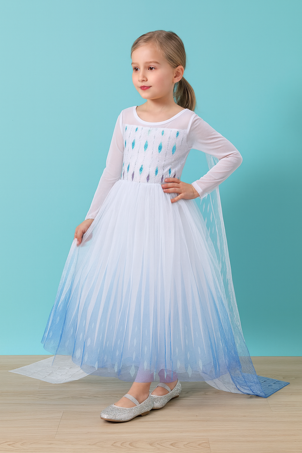Predstavljamo savršenu haljinu za sve male princeze koje žele da se osećaju kao prava princeza iz omiljenog crtanog filma! Ova raskošna, elegantna haljina dolazi u prelepoj beloj i plavoj kombinaciji boja, ukrašena detaljima koji podsećaju na magiju leda. Sa dugim rukavima i prozirnim slojem tila, haljina daje efekat raskoši i gracioznosti.