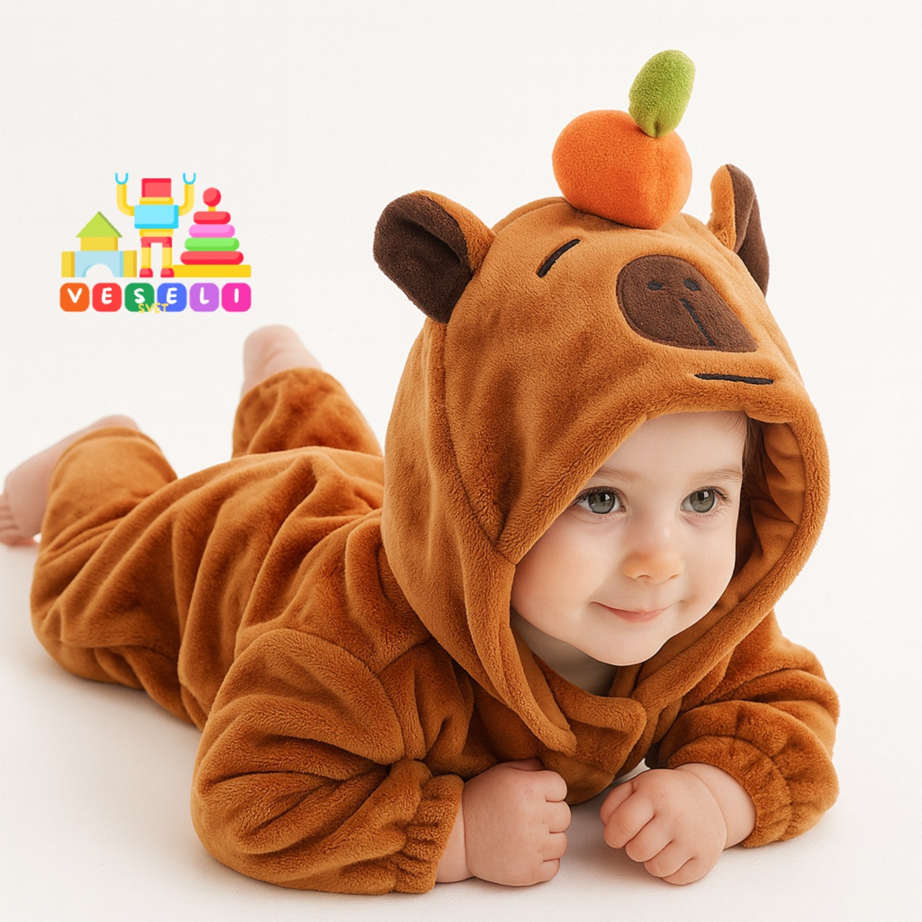 Preslatki plišani kostim za bebe izrađen je od izuzetno mekog i prijatnog materijala koji greje, a pritom ne iritira kožu. Kostim dolazi u toploj braon boji, sa kapuljačom koja ima uši, njuškicu i dekorativnu breskvicu na vrhu, što ga čini neodoljivo slatkim.